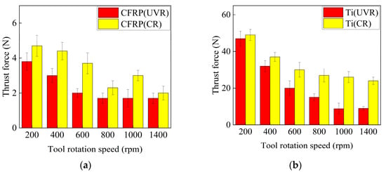 Comparison of thrust forces at different levels of tool rotation speed: (a) CFRP; (b) Ti.