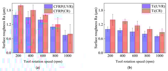 Comparison of surface roughness at different levels of tool rotation speed: (a) machined CFRP surface; (b) machined Ti surface.