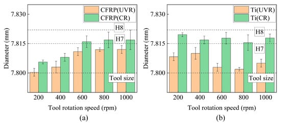 Comparison of diameter at different levels of tool rotation speed: (a) machined CFRP surface; (b) machined Ti surface.