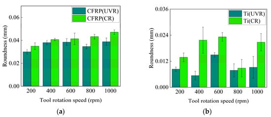 Comparison of roundness at different levels of tool rotation speed: (a) machined CFRP hole; (b) machined Ti hole.