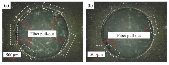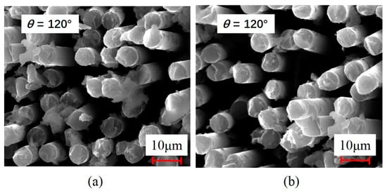 The morphology of Figure 21 is observed when the cutting angle of the fibers is around 150°. Figure 21a is the morphology of ordinary reaming. It can be seen that most of the breaks of carbon fibers are transversely broken along the fibers due to the extrusion of carbon fibers by the cutting edge of the reamer. The debonding breakage of fibers and resins also causes some of the outer surfaces of carbon fibers to be exposed outside the cutting surfaces. Fiber ports are unevenly arranged, with many small segments, not completely cut off, connected to the fiber head, resulting in poor surface roughness. Figure 21b shows the morphology during ultrasonic reaming. Similar to ordinary reaming, there are many fiber breaks of different lengths, but these breaks are flatter than with ordinary reaming, and the roughness is significantly improved with ordinary reaming.