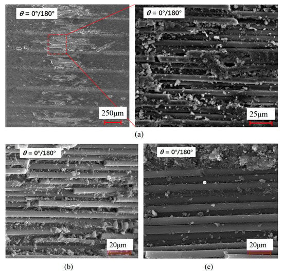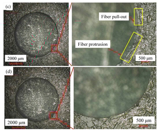 CFRP laminates are composed of carbon fibers and resin matrix, which determine the main material breakage is fiber/resin debonding and fiber breakage. Carbon fibers are mainly brittle before fracture. Fiber/resin debonding occurs close to the 0/180° fiber cutting angle area. As shown in Figure 16a,b, carbon fibers are fully exposed to the machined surface during ordinary reaming. Some carbon fibers break along the transverse direction because when the fibers/resins are debonded, they break after bending to a certain extent. It can also be seen that a small portion of the fibers break lengthwise due to the extrusion of the carbon fibers under the action of the cutting edge and the flank face. Figure 16c is a break diagram of CFRP fibers under ultrasonic reaming, from which it can be seen that the exposed fibers show significantly less transverse breakage and no longitudinal breakage.