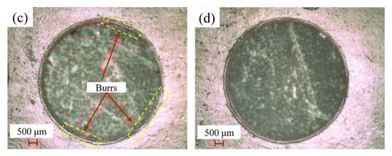 Figure 14 presents the surface appearance of the entrances and exits of the titanium alloy by CR and UVR. At a rotational speed of 600 rpm, the entrances machined by CR have chipping. In the experiment, the ultrasonic amplitude was 6 μm. In contrast, the entrances machined by UVR have a complete surface. When the reamer enters the CFRP-titanium alloy interface, the reamer is subjected to force fluctuations that cause damage to the area. The ultrasonic action reduces the cutting temperature, which makes the exit surface of the titanium alloy more complete than that of CR.