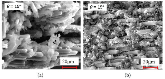 When the angle of cut of the fiber angle is 15°, the surface morphology is 3000 times larger under the scanning electron microscope, as shown in Figure 17. From Figure 17a, it can be seen in the fracture diagram of ordinary reamed fibers that the fiber fracture is parallel to the cutting surface. From 5000 times magnification of local fibers, the roughness of the fracture surface can be observed, and extrusion fracture of the fibers is obvious. In addition, some of the carbon fibers were exposed to the surface, indicating that there was also a fiber/resin debonding fracture. When the cutting edge direction of the reamer is the opposite to that of fiber, the debonding and fracture of fiber/resin occurs under the push of cutting edge, but it is shorter than the cutting angle of 0/180°. A recess in Figure 17a indicates a very uneven breakage during ordinary reaming. Figure 17b shows the breakage pattern of fibers during ultrasonic reaming. Compared with ordinary reaming, the breakage is uniform, and the cross section is smooth.