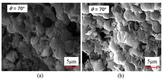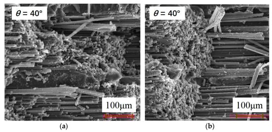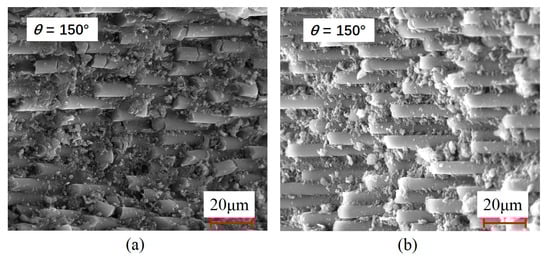 As shown in Figure 19, the 70° fiber angle, observed 8000 times larger under scanning electron microscopy, indicates the morphology, which is typical of fiber bending fracture and partial extrusion fracture. It can be seen from the diagram that the form of the fiber/resin debonding fracture is limited, so the depth of defects in this surface layer is very limited, and most of the fiber fracture is caused by bending fracture. Figure 19a is the morphology of ordinary reaming. It can be seen that the fiber fracture is rough and uneven, and there are many “round holes”, which are caused by uneven pull-out height of the fiber due to uneven bending and fracture. Figure 19b shows the morphology during ultrasonic reaming. It can be observed that the surface of carbon fiber fracture is relatively flat and the number of “round holes” is less than that of ordinary reaming. It shows that the bending fracture of the fiber is more uniform, and the pull-out height difference is smaller under the ultrasonic-assisted reaming.