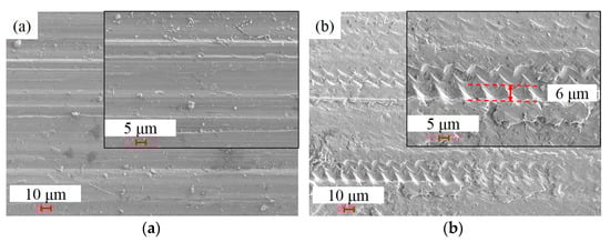 The area with the most surface pits occurs near the cutting angle of the fibers at 40°, as shown in Figure 18a. With ordinary reaming, the machined surface is serrated, and the surface quality is poor. The pit is the main cause of the formation of the serrated surface. It can be observed from the fracture surface that three fracture modes exist and alternate, including fiber shear fracture, fiber bending fracture, and fiber/resin debonding. Figure 18b shows the shape of the machined surface during ultrasonic reaming. It can be seen that the fiber/resin debonding phenomenon is significantly reduced, the serrated shape is more uniform, and the pit fluctuation is smaller than that of ordinary reaming. As the surface quality at the cutting angle of this fiber is the worst, it is the main reason for the formation of the hole wall morphology.