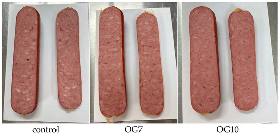Cross-sectional view of semi-smoked sausages: OG7—sausage with 7% of oleogel; OG10—sausage with 10% of oleogel; Control—sausage without oleogel.
