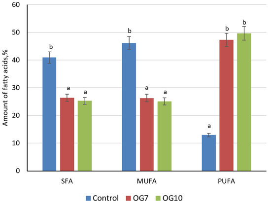 Comparative analysis of fatty acid content in control and experimental samples of semi-smoked sausages: SFA—saturated fatty acids; MUFA—monounsaturated fatty acids; PUFA—polyunsaturated fatty acids; OG7—sausage with 7% of oleogel; OG10—sausage with 10% of oleogel; Control—sausage without oleogel. Different letters above the bars indicate significant differences between samples (p < 0.05).