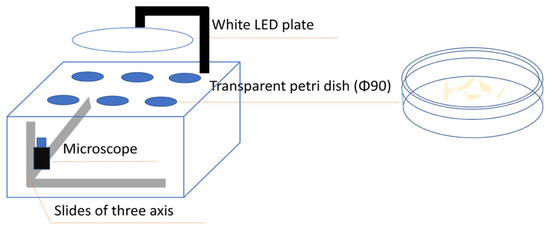The device used for filming is a self-designed in situ microscopic imaging system for cells. As shown in Figure 1, the Petri dishes are simply placed on the culture rack made of a hollowed-out acrylic plate, and a white LED panel designed as the lighting source is suspended above the culture rack. A camera fixed on a three-axis motor is arranged under the culture rack by which the cells in the culture medium are directly filmed through the transparent culture dish and the three-axis motor drives the camera to find the exact focus and realize the field of view switching. The camera used here is a Basler-aca2500 equipped with a 10X optical lens as shown in Table 1.