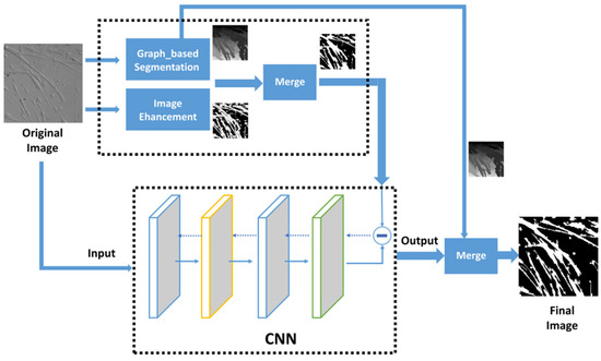 The proposed algorithm is a neural network learning method based on superpixel segmentation. As shown in Figure 2, the main structure of the algorithm can be divided into two key parts: one is the process of generating a reference image in an automatic way, and the other part is the learning network. At the outset, a graph-based segmentation is adopted to obtain appropriate superpixels. Then the Laplacian operator for image enhancement is employed in the original cell image to assist in merging superpixel regions to obtain a reference image for the CNN network. The original image is then put into the CNN and the cross entropy loss between the output and the reference image is calculated and back propagated for the network to study. The network’s final output is the last epoch’s training outcome at the same time and the ultimate segmentation of the cell image is the network’s output blended with the superpixels region.