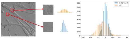 The grayscale of the cell and background are too close to distinguish cells from the background simply through gray values due to the similar transparency of cells and the culture medium. The size 6 of 10 × 10 pieces of the cell and the background from one grayscale image are cropped independently and the histogram is plotted as shown in Figure 4. Although both of them are Gaussian distribution, there are some deviations in means and variances which shows that the distribution of values inside the cells is relatively dispersed with richer details while the background part has relatively concentrated values and lacks rich texture. According to this difference between cells and background, the image enhancement operation in pre-processing is chosen rationally.