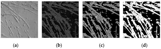 In the actual processing, the original map is firstly Gaussian filtered to reduce noise, followed by the Laplace operator. After taking the absolute value of the Laplace image, the median filter and binarization are executed so that the cell region and the background region can be initially distinguished. The results of each step are shown in Figure 6 for the Gaussian blur, Laplace processing, median filtering, and the final binarized image.