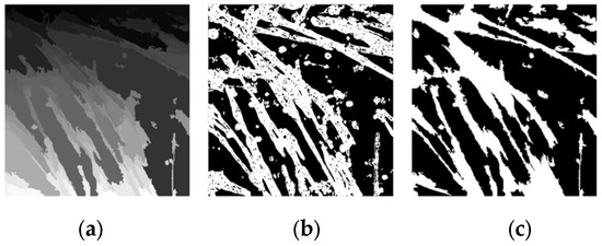 Images of superpixel merging. (a) Superpixel image. (b) Enhanced binarized image. (c) Merged reference image.