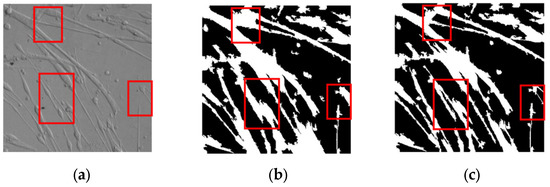 Figure 9 shows the comparison between the reference image and the learning result after training 20 epochs. Although the learning result of CNN is obtained according to the reference label, the adjusted result is significantly better than the reference label. The red boxed areas in Figure 9 shows that the reference image incorrectly segments the background area as the foreground area of the cells while the CNN segmentation results can distinguish the foreground cells from the background more finely.