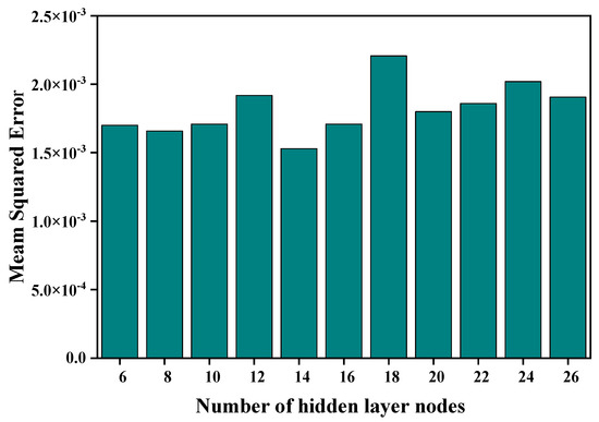 - Determination of the number of hidden layer nodes: the hidden layer node is determined based on the complexity of the problem being solved, the amount and quality of the available data, and the desired level of accuracy. Therefore, in this study, a trial-and-error approach was used. A different number of nodes was adopted, and the performances of the networks were compared. The performance was measured in terms of the mean square error (MSE). The number that performed best on the validation set was optimal, as shown in Figure 1.