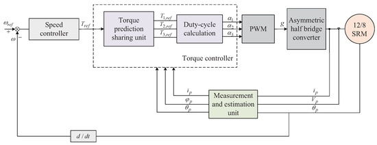 In Figure 2, the total reference torque signal is output by the speed controller and used as an input to the torque controller. Then, the duty cycle of each phase is calculated using the phase reference torque and output to the PWM unit. Finally, the converter controls the SRM to output the corresponding torque. In this paper, the speed controller is a proportional-integral (PI) controller, and the torque controller is designed by the control algorithm proposed in this section. In the torque controller, the phase reference torque is output by the torque prediction sharing unit. Therefore, to make the phase torque track its reference signal, (5) is usually used to calculate the duty cycle.