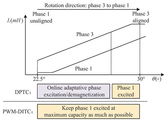 Torque ripple is a non-negligible problem for torque control of the SRM, but a higher copper loss is also undesirable [9]. It can be seen from the previous section that the PWM-DITC algorithm maintains the reachability of the phase reference torque, and the sum of the phase reference torque is always equal to the total reference torque. However, the phase current during commutation is not optimized, and undesirable results, such as a higher copper loss in the phase winding, may occur. Therefore, a novel DPTC algorithm is proposed in this section for optimizing the commutation operation of the SRM.
