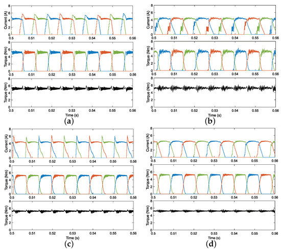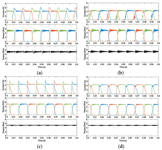 The indirect methods focus on splitting the total torque signal into phase reference signals using a torque sharing function (TSF) and keeping the total output torque constant by controlling the phase current. In [6,7,8], it is also proved that the phase torque can be controlled indirectly by adjusting the phase current. Since the phase reference signals are calculated from the sharing function, the control effect of this method is directly affected by the TSF [9]. In [10], the torque ripple suppression capabilities of linear, sinusoidal, cubic, and exponential TSFs are evaluated and improved, respectively. In conventional TSFs, due to their fixed parameters and limited voltage source, problems such as high current peak, high copper loss, and low-speed range may be generated [11,12]. Therefore, many types of TSF are designed to accomplish the optimization of multiple control objectives simultaneously. In [13], in order to expand the applicable speed range of the TSF method, the commutation process is defined as two cases and a torque error proportional compensator is designed to reduce the maximum change rate of the flux linkage. In [14], an offline TSF is designed to optimize both torque ripple and copper loss. Since only one weight parameter is included in the objective function, the application of this method is simplified. In [15], an optimization problem is formulated based on the offline TSF, and the GA optimization algorithm is used to minimize the torque ripple and copper loss. In [16], an online optimization method for the TSF is developed to smooth the total output torque by compensating for the tracking error of the phase torque. Since the phase current is a direct control variable in the TSF method, it is also necessary to design an additional current controller. In [17], a PWM current controller with parameter adaption is proposed, which aims to improve the response speed and control accuracy of the phase current. In [18], in order to reduce the torque ripple, a predictive current controller is designed. Additionally, considering the disturbance in the system, an additional disturbance observer is proposed to improve the robustness of the current controller. In [19], a deadbeat predictive current controller is developed to achieve low torque ripple over the full speed range.