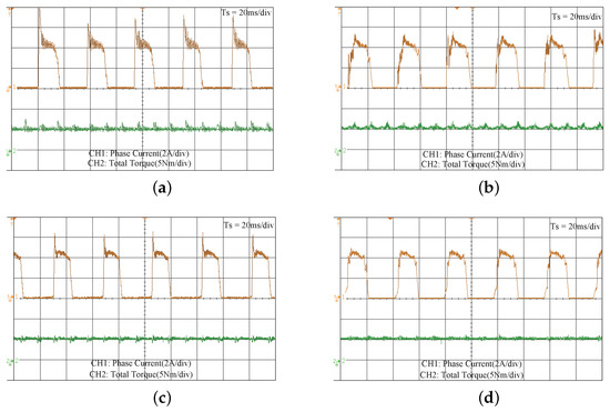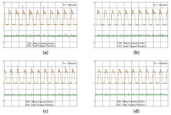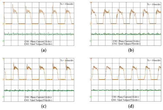Figure 10, Figure 11 and Figure 12 show the experimental results of the four methods at 200, 400, and 800 rpm speeds when the load is 5 Nm. From the current waveform of the above methods, it can be seen that the DITC and PWM-DITC still have larger current peaks than the other two methods, which is not expected during the experiment. Moreover, the proposed DPTC method has smoother phase current and phase torque curves than the MPTC method.