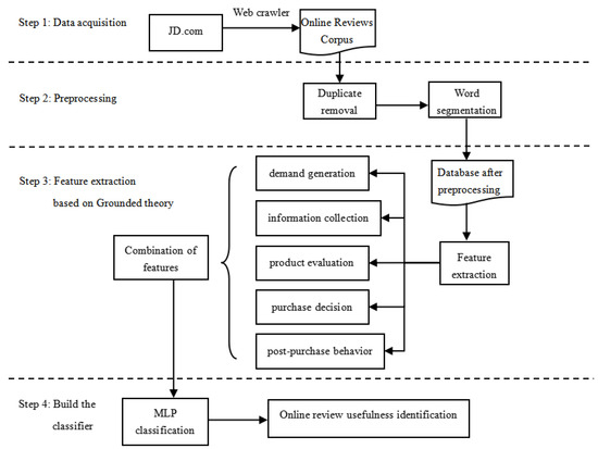 The specific steps of the research method proposed are as follows: Firstly, in the stage of data acquisition and preprocessing, the online review database of related products crawled from JD.com (accessed on 5 November 2022) is established and the data preprocessing is carried out. Secondly, in the feature engineering stage, feature extraction is carried out from each stage of the consumer decision-making process based on the Grounded theory. Through the semi-structured interview data of 35 consumers, feature extraction is carried out on the usefulness of online reviews from the stages of demand generation, information collection, product evaluation, purchase decision, and post-purchase behavior. The extracted features are combined to obtain multiple feature representations of the usefulness of online reviews. Finally, multiple feature combinations are trained on the MLP classifier, the optimal feature combination solution is obtained through comparative analysis, and a reasonable interpretation is obtained in the real situation.