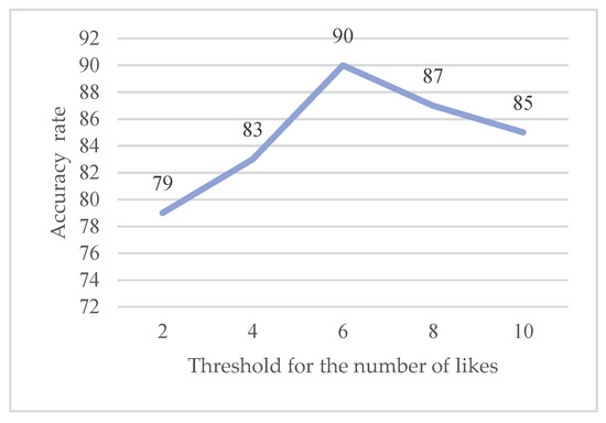 Since the machine learning classifier needs to divide the data into a training set and a test set, the training set is used to train and the test set is used to test, so as to verify the feasibility and accuracy of the method. In the problem of identifying the usefulness of online comments, its essence is a binary problem, which only needs to judge whether the online comment is useful or not. Therefore, the usefulness of online comments is recorded as +1, and the useless comments as −1. For the training set data, the determined classification results should be given to the machine to learn. In previous studies, some scholars annotated the training set data with artificial labeling, which is slightly less objective [30,31]. However, some of the literature regards the number of likes on comments as the degree of usefulness of online comments [32]. Although this index cannot be summarized simply, it is interpretable in the automatic labeling and recognition of training sets. Therefore, the number of likes on comments is chosen as the index for automatic labeling of training set text. In addition, for the selection of the threshold for the number of likes, 100 pieces of data randomly selected from the data were marked with the category of manual labeling on usefulness, adjusted the results of automatic labeling under different thresholds, and compared them with the results of manual labeling. The fluctuation of the accuracy rate is shown in Figure 4. It can be seen that with the increase of the number of likes threshold, the accuracy of the automatic labeling results increases first and then decreases. It reaches its peak value when the number of likes threshold is 6. Therefore, the number of likes indexes for automatic labeling in the training is set at 6, which can make the automatic labeling classification results accurate and reliable.
