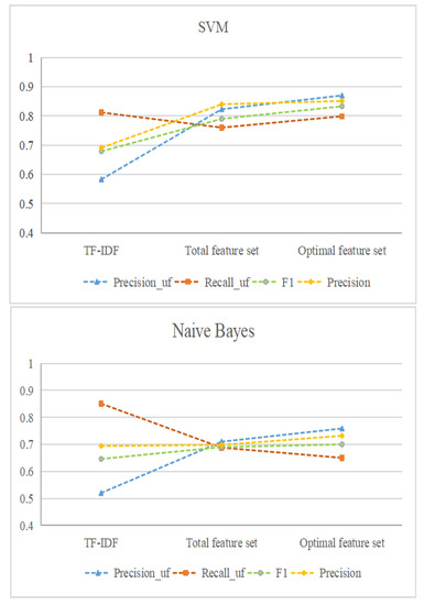 - In the comparison of the three feature extraction methods, the optimal feature combination has the best performance, and its recognition effect on the three different classifier models is excellent. For the SVM classifier model, the F1 value based on optimal feature combinations is between 4.3% and 15.4% higher than those based on all feature combinations and the TF-IDF method. For the Naive Bayes classifier model, the F1 value based on optimal feature combination is between 1% and 5.4% higher than those based on all feature combinations and the TF-IDF method. For the MLP neural network classifier model, the F1 value based on the optimal feature combination is 0.4% and 30.1% higher than those based on all feature combinations and the TF-IDF method. It can be concluded that the selection of the optimal feature combination significantly improves the recognition effect of the classifier.