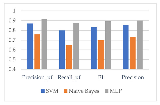As can be seen from Figure 7, in terms of the selection of classifier models, the MLP classifier has the best overall recognition effect, and all indexes are higher than the other two traditional classifiers. The F1 value of the SVM classification model based on the optimal feature combination is 83.3%, while the F1 value of the MLP classifier is 6% higher than that of the SVM classifier, reaching 89.3%. Because the SVM classifier is also very suitable for the analysis of short text data, the classification effect is not as outstanding as that of the MLP classification model, but it still meets the basic standard. The F1 value of the Naive Bayes classification model based on the optimal feature combination is only 70%, and the F1 value of the MLP classifier is 19.3% higher than that of the Naive Bayes classifier. Although the optimal feature combination improves the classification effect of the model, the selection of the classifier is still particularly important. So it can fully reflect the matching degree of the optimal feature combination representation and the MLP classifier model, and it also proves the effectiveness of the recognition results.