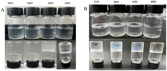 (A) 4 °C 10 min self-gel (B) 4 °C 30 min self-gel. (Note: (A) is 10 min self-gel at 4 °C, in which M03 and M04 failed to gel when inverted for 10 min, M06 and M08 could gel, (B) is 30 min self-gel at 4 °C.M03, M04, M06 and M08 all became gel).