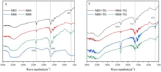We observed that the absorption peak of amide A that is attributed to the N-H stretching vibration was 3400~3440 cm−1. When the N-H group was involved in hydrogen bonding, the absorption peak of amide A shifted to a lower position, with stronger hydrogen bonding causing a greater shift. We found that the position of the amide A absorption peak was essentially the same for all samples. However, as crosslinking by TG enzyme generated more amide bonds and increased covalent bonding energy in gelatin [32], we detected that the amide A absorption peak in enzymatic gels was mainly shifted to a lower position. We specifically observed a greater shift in the distance of the amide A peak between the self-assembled and enzymatic gels, suggesting changes in the physical and chemical properties of gelatin and enhancement of gel strength.