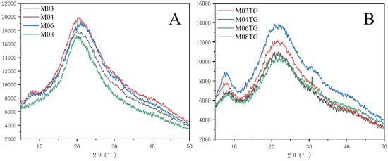 We tested the diffraction effect of gelatin by X-ray diffraction (XRD), as shown in Figure 5. We found that self-assembled gels exhibited two diffraction peaks, a small peak at 7° (2θ), the intensity of which reflected the triple helix content in gelatin, and a stronger broad peak at 20° (2θ) attributed to the large number of polar groups in the gelatin molecular chain, which will form intra- or intermolecular hydrogen bonds. The highly ordered arrangement of these hydrogen bonding networks can transform gelatin into an amorphous structure (non-crystalline structure) with a uniform polymeric network structure. We detected that the position of the diffraction peak at 20° did not change between gels, with the intensity of the amorphous characteristic peaks of these four gelatins being continuously weakened from high to low, thereby preventing the formation of an ordered microcrystalline structure. We further observed that after crosslinking by the TG enzyme, the position and intensity of the small peak at 7° (2θ) of the enzymatic gel did not differ from that of the self-assembled gel, indicating that the triple helix content remained unaltered. However, as crosslinking by the TG enzyme increased the hydrogen bonding between gelatin molecules, we noticed that the peak intensity at 20° in the enzymatic gel was decreased compared with that in the self-assembled gel, suggesting an increased structured order in the enzymatic gel.