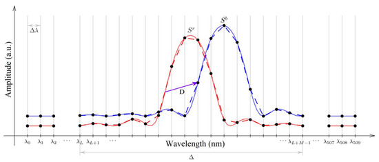 The position of the FBG spectrum was studied in a controlled wavelength range λB ± Δ/2, at Δ = 3 nm, which determined, taking into account the spectrum analyzer’s resolution, the dimension of the neural network input data M = int(Δ/Δλ) + 1. Within the scope of the problem just described, this range included 19 spectrum values, determining 19 input values of the neural network. The spectra of the same FBG for two different positions (red and blue lines) are schematically shown in Figure 1. The solid line shows the true FBG spectra (as if they were obtained with any arbitrarily small discretization interval), and the dots show the values of the spectra obtained discretely. Figure 1 uses the following designations: Sr and Sb are spectra at two positions; λi is the wavelength, λL is the wavelength of the left, and λL+M−1 is the right boundary of the controlled part of the spectrum; Δλ is the discretization interval; and D is the relative shift vector of the spectrum (Sb vs. Sr), which is the same for all spectrum points.