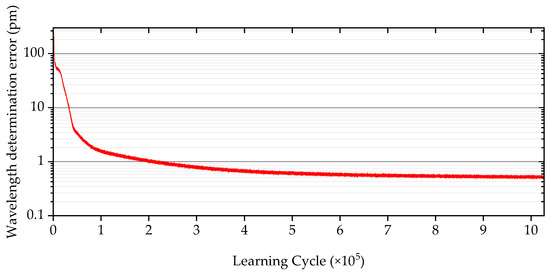 The neural network training that had occurred before the criterion met the requirement (5) amounted to a little more than 106 training algorithm iteration cycles. Figure 3 shows the dependence of the absolute error in determining the FBG central wavelength found according to norm (3) on the number of training process cycles. The dependence in Figure 3 is plotted on a semi-logarithmic scale for better visualization. The error value begins to slow after 106 training cycles and stabilizes at around 0.525 pm.
