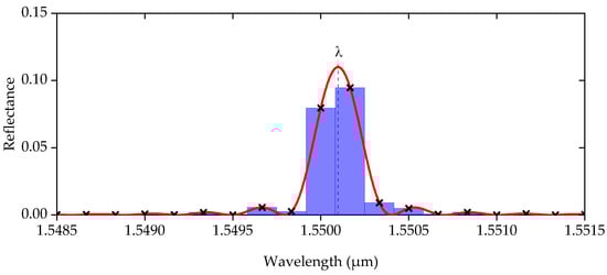 In our situation, we were using an I-MON-512 Interrogation unit [24]. We assumed a fiber Bragg grating (FBG) with a length L ranging from 0.5 to 3.5 mm, a period Λ varying from 531.111 to 531.472 μm, and an induced refractive index n ranging from 0.5∙10−4 to 1.5∙10−4, which was subjected to a specific physical effect (stretching/compression, temperature, etc.) causing a shift of the FBG central wavelength. With such parameters, the FBG central wavelength λB ranged from 1549.5 to 1550.5 nm, and the full width at half maximum of the spectrum ranged from 0.229 to 1.458 nm. The broadband radiation from a superluminescent diode was directed to the FBG via a fiber optic circulator, and the I-MON-512 spectrum analyzer received the reflection spectrum. The left and right boundaries of the controlled spectral range were λmin = 1510 nm and λmax = 1595 nm, respectively; the number of points in the spectrum was N = 510; and the discretization interval was Δλ = (λmax − λmin)/N ≈ 0.167 nm.