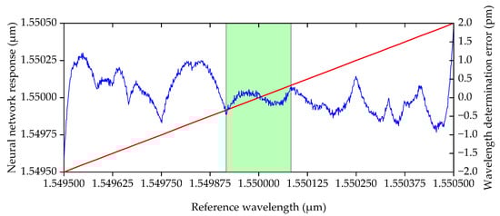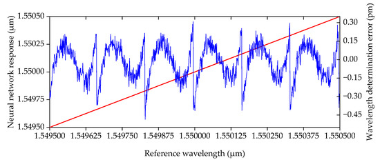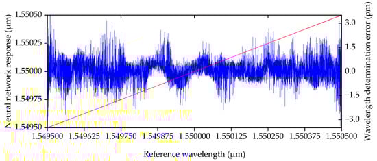 Figure 5 shows the neural network response’s dependence on the values of the FBG central wavelength λ for 104 iterations of the verification algorithm. The red line represents the dependence corresponding to the neural network model’s response; the blue line (along the additional axis) represents the magnitude of the error in the central wavelength determination .