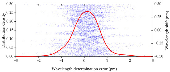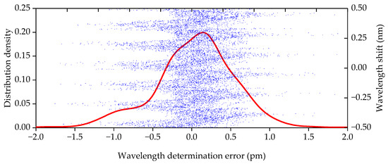 The distribution density of errors in determining the FBG central wavelength for each approach (fixed and variable boundaries) is shown in Figure 8 and Figure 9, respectively. In addition, the value of the FBG central wavelength error corresponding to the central wavelength shift for λB is plotted on the abscissa axis (on the additional ordinate axis).