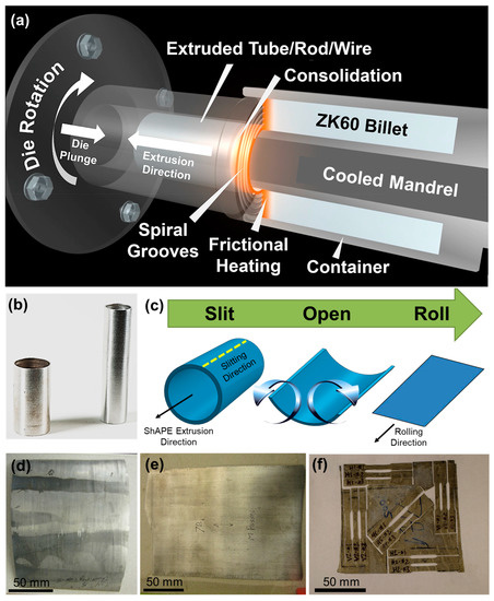 Extruded ZK60 tubes were fabricated from ZK60-T5 bar and as-cast billets using the method described by Whalen et al. [5]. This resulted in tubes having an outer diameter of 50.8 mm and a wall thickness of 1.9 mm which were sectioned transversely into approximately 200 mm long sections. After this transverse sectioning, the tubes were slit along the extrusion direction and forced open at room temperature using a vice. Figure 1a shows a schematic of the ShAPE process configured to extrude round tubes using a rotating die with a stationary mandrel. Figure 1b shows examples of the as-extruded tubes. Figure 1c shows a schematic of the slitting, opening, and rolling operation, and Figure 1d–f shows the actual sample after slitting, rolling, and cutting into tensile specimens.