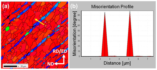 (a) Grain orientation (IPF Y) map showing the deformation twinning between two grains in the as-flattened ZK60; (b) Misorientation profile on an EBSD map of the as-flattened ZK60 plate. The yellow arrow in Figure 3a indicates the location and direction of the misorientation line profile.