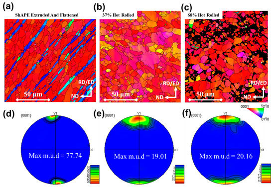 EBSD orientation (IPF Y) maps (a–c) and their respective pole figures (d–f) of the ShAPE extruded and flattened, 37% hot-rolled, and 68% hot-rolled ZK60 specimens, respectively, in the longitudinal section.