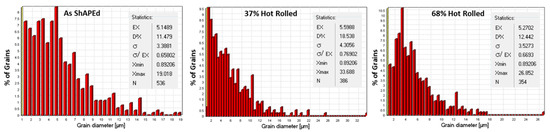 Plots of the grain size distribution for each rolling condition taken from longitudinal sections indicated relatively small changes in average grain diameter, as shown in Figure 6. Although the rolling process has visibly changed the grain structure, the average grain size remains approximately the same, beginning at 5.15 ± 3.39 μm in the ShAPE extruded material, to 5.27 ± 3.53 μm after 68% rolling reduction. Notably, this excludes the regions of the rolled specimens where obtaining a diffraction pattern was not possible. It was also noticed that while the average grain diameters are the same with respect to rolling extent, the maximum grain size, Xmax, after hot rolling had increased. From Figure 6, the maximum grain sizes grew from ~19 μm to 33.6 and 26.8 μm after 37% and 68% hot-rolling, respectively.