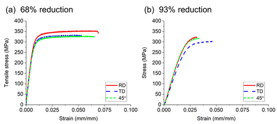 (a) Representative tensile stress-strain curves of the ShAPE-processed ZK60 flattened and hot-rolled to 68% reduction. (b) Representative tensile stress-strain curves of the ShAPE-processed ZK60 flattened and hot-rolled to 93% reduction. Plots are shown for loading in the rolling direction (RD), 45° to the rolling direction (45°), and the transverse direction (TD).