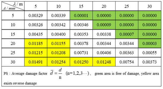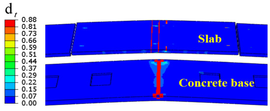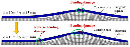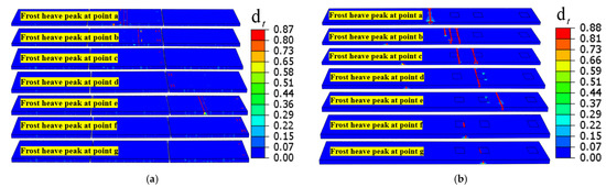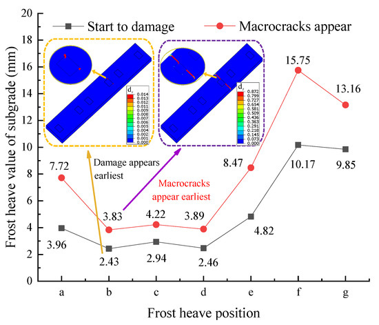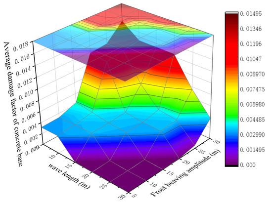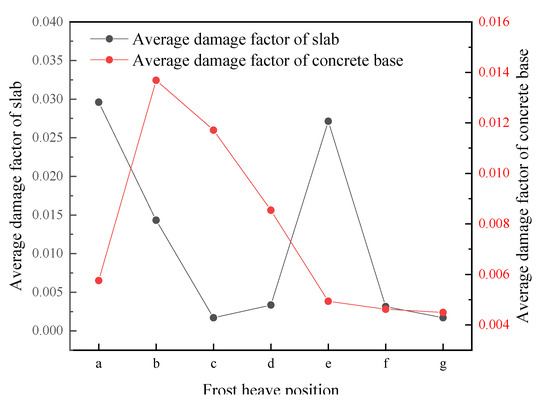 - When the frost heaving wave peak is on grooves in the middle of the base (b), initially, damage and macroscopic cracks of concrete base appear. When the frost heaving wavelength is 10 m, the frost heaving values corresponding to initial damage and macroscopic cracks are 2.43 and 3.83 mm, respectively. When the frost heaving position is near the slab center, the damage to the slab is significant. It occurs near the center of the slab.