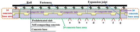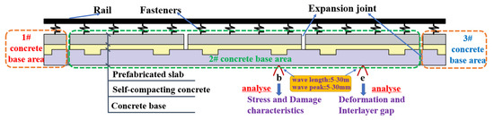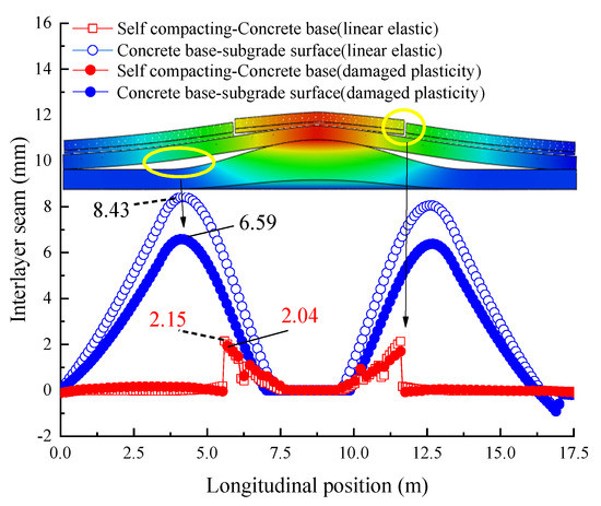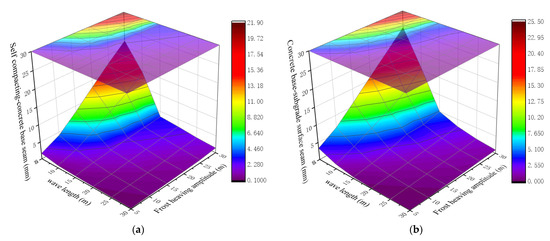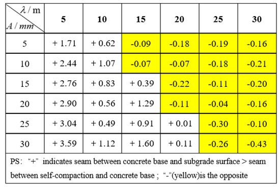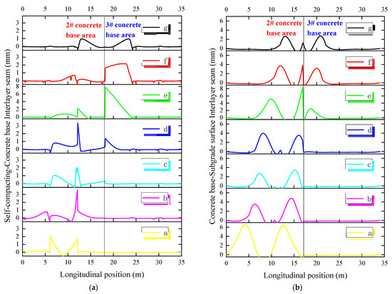 - The peak value of the seam between the self-compacting concrete and the base normally occurs at the self-compacting concrete edge. When the frost heaving wave peak appears at the position that is one-sixth of the base length from the edge of the concrete base (e), due to the lack of longitudinal constraints at the base edge and the formation of a lever system in the middle of the self-compacting concrete, the seam between layers reaches its maximum value at 7.94 mm. The maximum and minimum interlayer seams between the base and the subgrade surface occur when the frost heaving positions are at one-sixth of the base length from the edge of the concrete base (e) and the expansion joint of base (g), respectively.