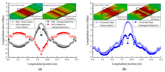 - Based on the concrete damage plasticity theory, the damage plasticity parameters of concrete in a track structure are deduced and the correctness of the parameters is verified. The damage plastic model can reflect the softening behavior and stress attenuation phenomenon of the concrete in the track structure after reaching tensile strength. The analytical results are consistent with the on-site condition, which fully demonstrates the necessity and superiority of considering plastic damage on concrete materials.