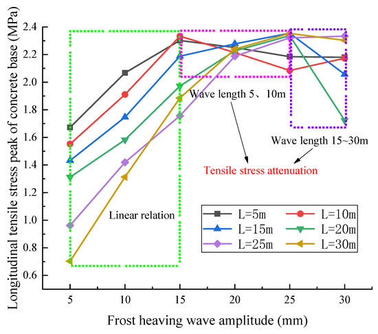 - When the frost heaving wave amplitude is 15 mm or less, the normal relationship between the maximum tensile stress of the base and the frost heaving amplitude is linear. At this moment, the base has not been damaged or the damage is limited. When the frost heaving wave amplitude reaches 15 mm, 25 mm, and 30 mm, the peak tensile stress of the base reaches the maximum tensile strength, and the stress attenuation phenomenon occurs. The corresponding minimum allowable frost heaving wavelengths are 10 m, 20 m, and 30 m, respectively.