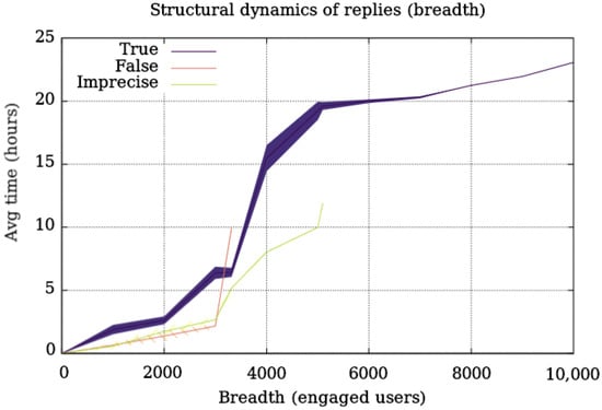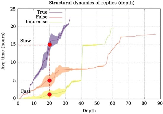 Figure 1 shows that, for a fixed depth of the cascades (the figure marks a depth of 20), the time required to reach that depth depends on the type of content. While imprecise content takes an average of 2 h to obtain that depth, true content takes 15 h. This finding indicates that the contents’ speed (depth axis) is conditioned on veracity. Furthermore, the figure shows that imprecise contents acquire a greater depth in less time than false or true contents.