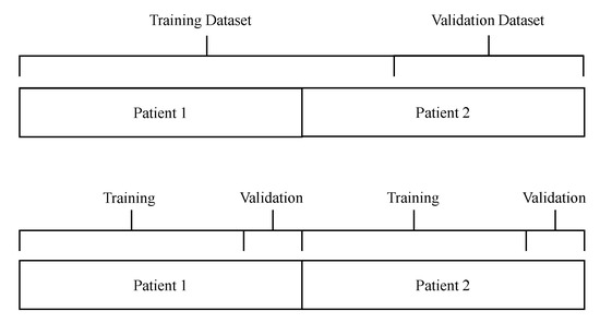 However, if the same splitting procedure is applied to the population partitions in (12), (), and (), an undesirable effect is detected. As an example, the top image in Figure 2 shows the application of the procedure to a cluster from the partition . It can be seen that, provided that each cluster contains data from different patients and that data is stored in order in the original clustered partitions, the two parts for identification (training and validation) will contain events from completely different patients (patient 1 is used for training, and only part of patient 2 is used for validation). In the case of this work (10 patients), this procedure will lead to a scenario where patients 1 to 8 will be used to train the local models and the remaining patients will be used to validate the local model. In order to avoid this problem, it is extremely important to properly split the training and validation data from each patient. Therefore, the total number of patients present in each cluster will be identified and then the data from each one of them will be split using the 80/20 criteria, as presented in the bottom image in Figure 2 for the partition . In this way, the right proportion of data from each patient is ensured in the training and validation split.
