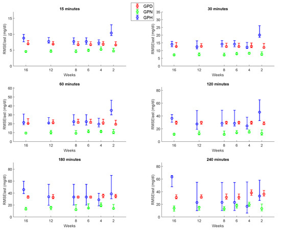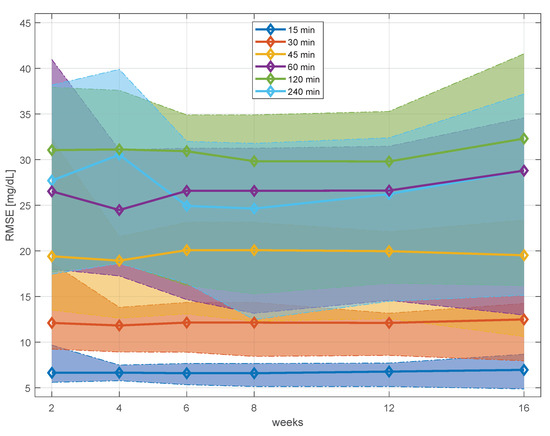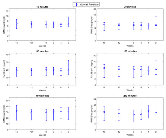 Similar trends are observed if the Overall prediction error is analysed, as seen in Figure 4. For the shorter PHs (), the error bars of the two-week dataset are significantly larger than all the other (larger) datasets used for training, suggesting that a critical volume of training data for obtaining consistently good predictions is more than two weeks. For longer PHs, lower RMSE values tend to be achieved when larger datasets are used for training (6, 8 or 12 weeks of data vs. 2 or 4), but this trend is inverted when the dataset volume is increased to 16 weeks. This suggests that using 16 weeks of data from a whole cohort of patients to train models might lead to subpar predictions, since more dynamics are modeled that may not be used to provide accurate predictions of an individual patient.