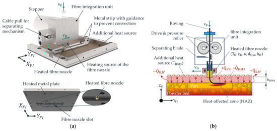 3D view of the fibre integration unit (without powder bed) (a) and a schematic of the process zone (b) [22].