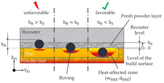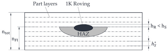 To determine the roving overlap, the total part thickness is first determined. Based on the known total number of powder layers per part = 30, the thickness per layer (0.095 mm) can thus be determined—see Figure 6. This layer thickness is necessary since the part will shrink during cooling. In addition, the roving overlap can be determined from the known integration layer of the roving at = 25. The roving overlap is compared to the set powder layer thickness during printing and/or the movement level of the recoater at (=0.1 mm) and should be ideally <.