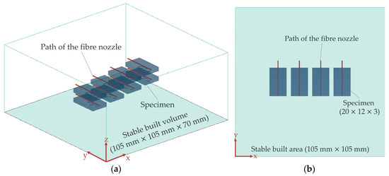 3D view of the arrangement of the specimens in the built volume of the LS machine (a) and a top view (b) with the movement path of the fibre nozzle (red lines).